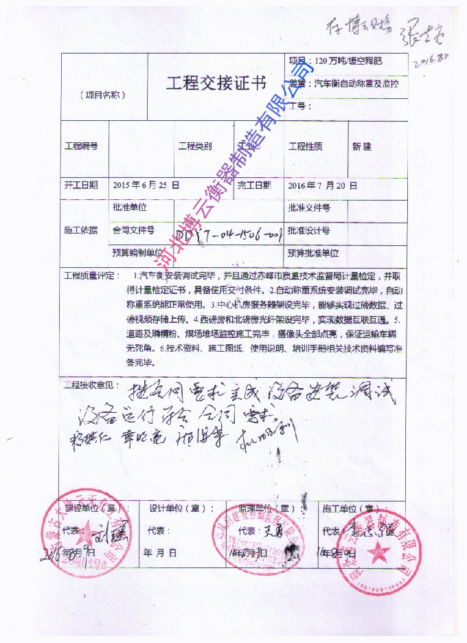 汽車衡稱重系統(tǒng)項目驗收合格 工程交接證書